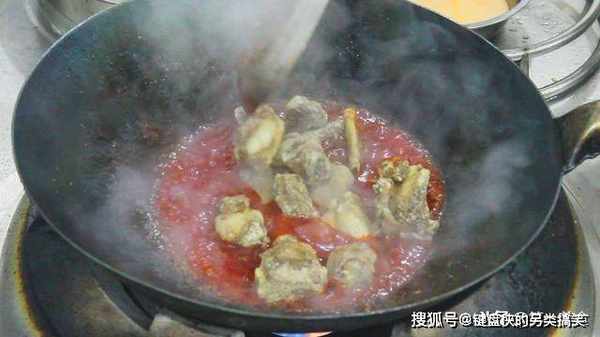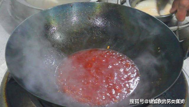 锅内留油,倒入蒜沫,闻到蒜香以后,加入一勺番茄酱,翻动几下。加入