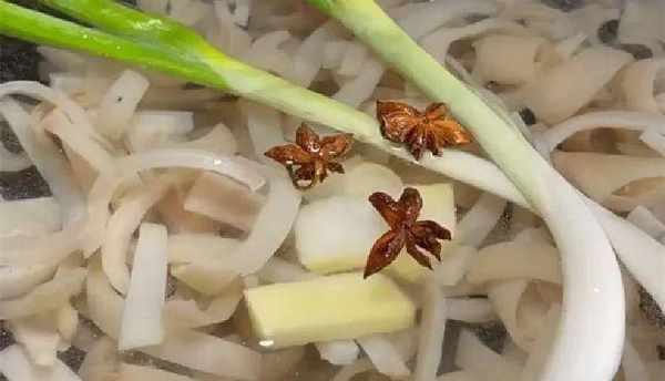 3.另外起一锅将切好后的猪皮条放在锅里面加入水,生姜,蒜还有八角少量的食盐。这个时候很多人在问,水跟猪皮的比例多少合适?一建议1:1.5的量,然后放在锅中炖煮一个小时。将锅里面的猪皮炖烂,炖好后的猪皮放在盆里面,然后放凉。