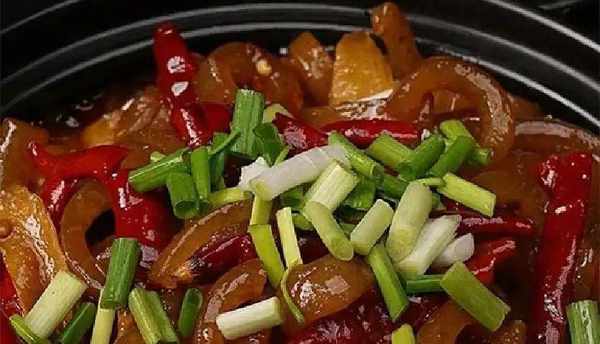 5.用啤酒焖煮出来的猪皮特别鲜,还有淡淡的酒香味,特别好吃。好打开锅,非常的香,铲子给炒均匀,一份色泽诱人的焖猪皮就完成,撒上葱段出锅即可。