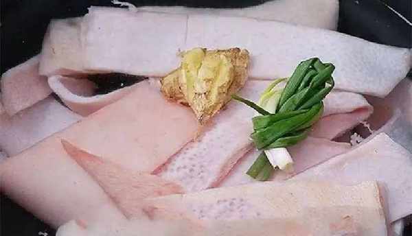 1.洗净后的猪皮放在锅里面,加入生姜跟小葱,一点点料酒,这样可以起去腥的作用。焯水后的猪皮再捞出,用刀把里面的油脂刮干净,加入适量的面粉,搓洗两三遍;