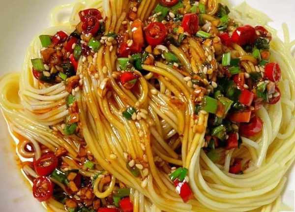 面条煮熟过凉水沥干水分,葱姜蒜切碎,小米椒切碎放入面条中,放入生抽,老抽,盐,辣椒面,白芝麻,葱花,锅中热油,淋在面条上拌匀即可,真的太香了。