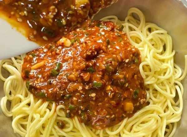 食材:面条,葱花,小米椒,蒜末,生抽,蚝油,辣椒面,鸡精,醋,芝麻油。