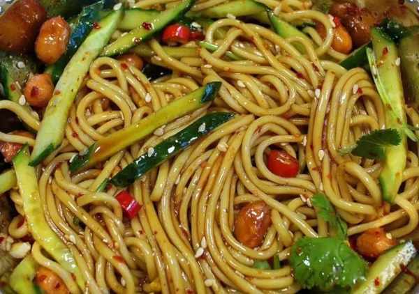 碗中加入五香辣椒面,姜蒜末,白芝麻,锅中热油,油温八成热浇在辣椒上,加入生抽,蚝油,醋,白糖,盐,芝麻酱拌匀,锅中烧水,下入面条煮熟,过凉水沥干水分,将调好的辣椒酱倒入面条中,加入花生,黄瓜丝拌匀就可以了,开胃爽口,不油腻,全家都爱吃。