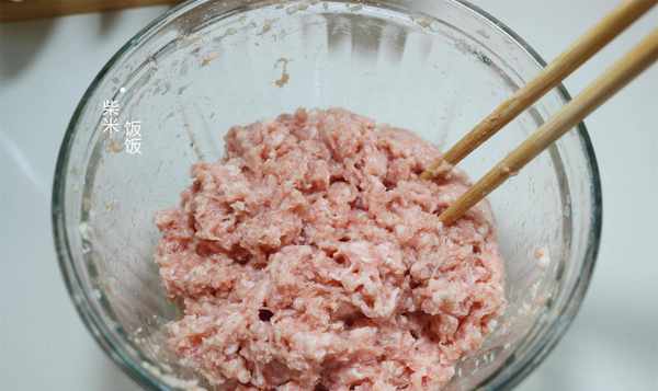 3.将猪肉卷入馅中,加入少量泡过的冷辣椒水分几次朝一个方向充分搅拌,让肉吸收所有的水分。喜欢馒头汤多的可以多放点花椒水。如果你想要肉馅刚好软嫩,又不喜欢汤太多,就少加点。猫肉一只,水150~300克,按需添加。