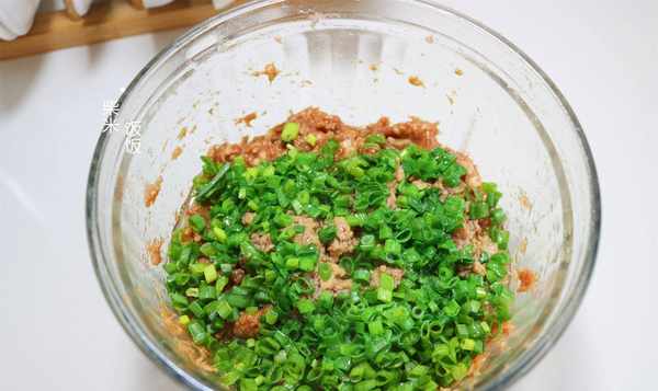 5.然后加入葱花,再倒入热油,再次拌匀,馅料就做好了。