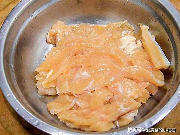 我们准备新鲜的鸡胸肉300克,把它切成均匀薄片放入清水中,抓洗出里面的血水,洗干净后挤干水分准备下一步的腌制。