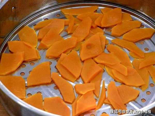 准备两块削净外皮的南瓜,切成均匀的薄片放入蒸笼里面,上汽以后蒸制15分钟即可。