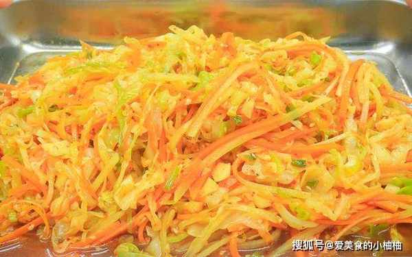 包菜对半切开,去蒂切丝,放入大盆中;土豆去皮,切成细丝,放入水中浸泡,去除土豆上的淀粉;胡萝卜也切成细丝,放入盆中,加入清水浸泡。