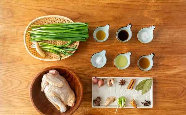 三黄鸡半只 姜3片 香葱3根 料酒/米酒1小勺 香油:花生油200g 韭菜5根 沙姜1颗 大蒜2瓣 香菜头4个 红葱头2颗 陈皮1瓣 香叶两片 草果2颗 丁香3-4颗 桂皮一条 八角2颗 生抽2大勺 芝麻油1小勺 盐1小勺 糖1小勺