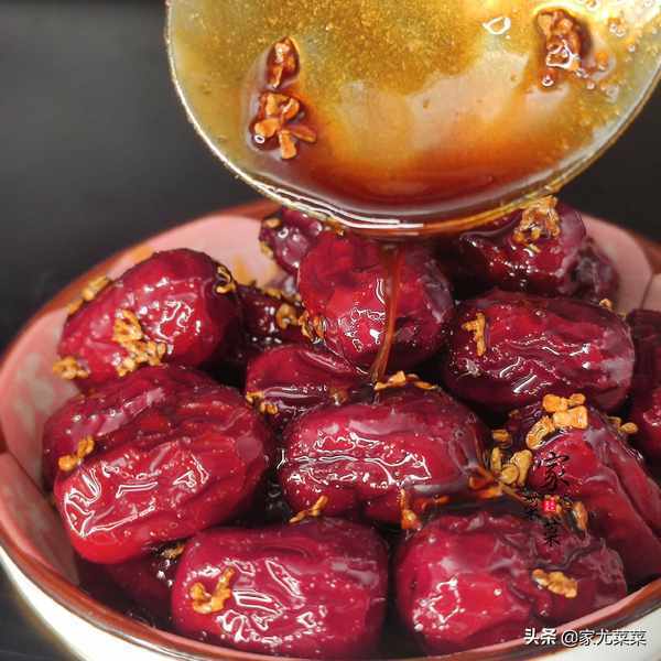 第四步:最后把红糖汁倒入红枣中,再撒点一点桂花搅拌一下就可以吃啦。(红枣皮不易消化,肠胃不好的人要去皮吃哦)