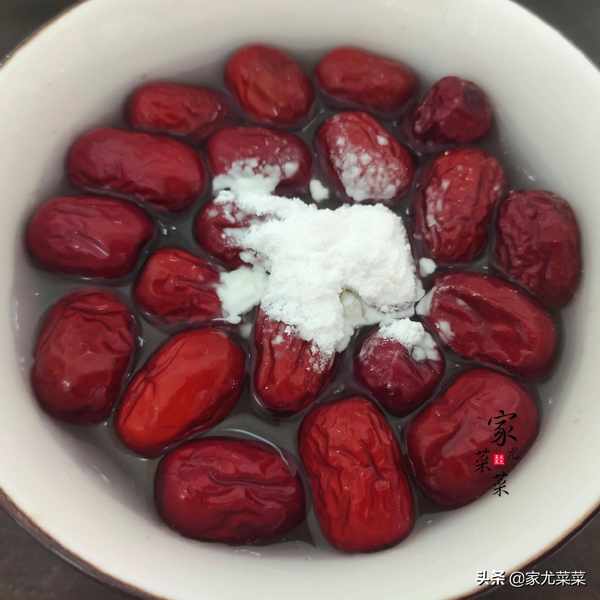 第一步:选用一小碟漂亮的红枣倒入水中,加入一小勺淀粉浸泡一会再搓洗干净。这个方法是为了很好地吸附掉红枣表面的灰层与细菌。