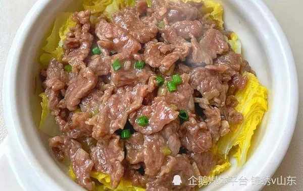 2、娃娃菜清洗干净切成小块,放在盘子的底部,再铺上腌制好的牛肉,水开上锅蒸15分钟。