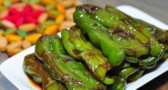 青椒洗净去根蒂去籽,用刀背压扁炒锅烧热放油,转小火放入青椒微煎,上盖焖2分钟左右,翻面继续焖,直到青椒皮起皱变软,放过量盐,生抽,加大批水上盖焖至青椒入味熟透即可