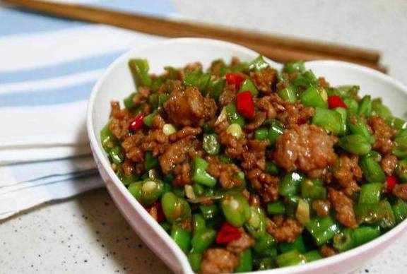 1勺料酒1勺糖1勺淀粉1勺生抽抓匀先把肉碎腌制10分钟豆角切成丁葱蒜小米椒切成丁锅底放过量植物油油低温的时分就把肉沫放出来煸炒加少许老抽调色然后乘出备用锅底放大批植物油把切好的葱、蒜、小米椒放入锅中炒出香味把豆角放入锅里翻炒边炒边加入大批的清水,一定要一点一点的放一定要大批多次加入,这样可以使豆角更容易熟而且颜色是翠绿的。豆角成熟之后加入之前超好的肉沫加过量的盐翻炒平均出锅之前可加少许鸡精(我没有加,尽量少吃味精嘿嘿)