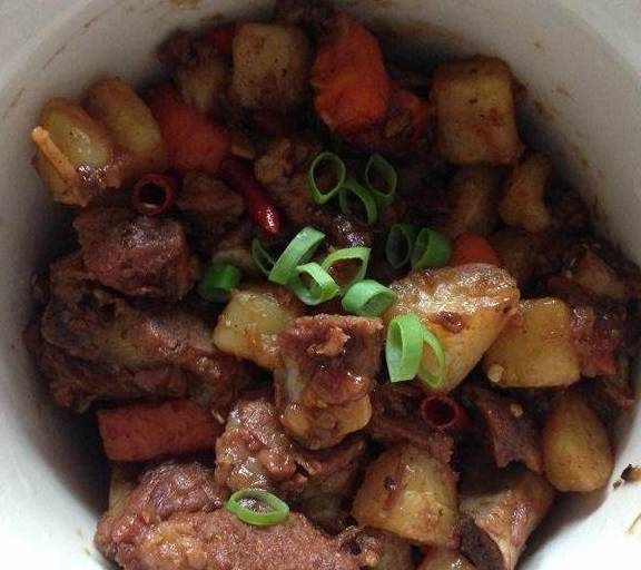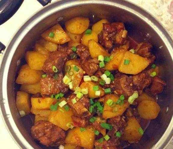 排骨洗净,开水焯,去浮沫。花椒八角葱段姜片,大批盐(有一点咸味即可)排骨,加水没过排骨,入高压锅,炖15min。待排骨炖好,高压锅排气阶段预备下一步食材。土豆胡萝卜切块,炒锅入底油,入胡萝卜土豆块翻炒至土豆块略透明。加排骨,加料酒生抽老抽糖,翻炒上色。加排骨汤没过排骨,加干辣椒,小火闷熟胡萝卜,大火收汁,加大批醋,根据口味加盐,出锅。