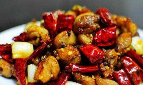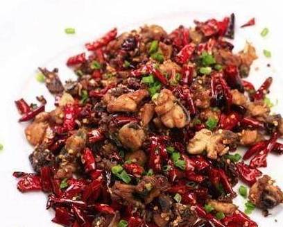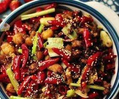 鸡肉洗净斩成小块用料酒、五香粉、盐、葱姜腌制20分钟以上(此步盐量可按炒菜的量来放)辣椒洗净切断滤掉辣椒籽(用一种不锈钢的细条做成的粗孔筐子过滤辣椒籽最方便,我还没买)备用花生油烧热笨办法,试一个鸡肉块炸的滋滋带响就可全部倒入倒入后定一下型后转中小火把鸡块完全炸熟炸透,颜色由白转黄后捞出再次把油烧热,二次油炸,火可以大一点,逼出多余油脂,同时让表面愈加金黄炸到金黄干香后捞出,沥干油备用锅中下底油,小火炒香花椒和姜片加入葱蒜、八角和香叶继续同炒(我家超级爱吃麻,花椒没有再滤出)加入辣椒翻炒平均,这时浓郁如餐馆的香味会不断飘出加入炸过的鸡块,继续翻炒加入极少的糖和盐烹入料酒(我直接下了白酒)和五香粉;想让鸡肉好嚼一点的之后还可加一点蔬菜水最后加入芹菜段翻炒至断生,撒上白芝麻点缀,华丽丽的扒开辣椒来找鸡的辣子鸡就完成啦