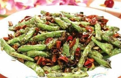 四季豆洗净去中间,把筋撕掉然后沥干水分,一定要干,不然炸四季豆的时分会有油溅出来的,很风险的锅中稍微放多些油,用大火炸四季豆大概3,4分钟这样,炸至外皮微皱即捞出盛起,滴去油份事前干辣椒切小段,蒜头用刀拍一下把四季豆捞出后,把锅中多余的油,装到碗中,锅中留点底油,油热倒入干辣椒,蒜头,姜丝爆香一下倒入捞出的四季豆加少许酱油,放糖,盐,鸡精(鸡精不引荐多吃),翻炒平均就可以啦