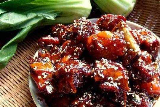 选精肋条拜托老板切成约4-5cm长的小段带回家洗净之后放入冷水里另添加1块拍碎的生姜去腥开战煮煮到水开后水面上会浮起一层血末,捞出。拣出排骨段用温水彻底清洗一遍沥水至于一旁待用。这时分可以根据本人爱好剥5-8枚大蒜。放在糖醋排骨酱汁里烧好的大蒜是相当好吃的锅里加入植物油(菜籽油为佳),保持中火将飞水过的排骨和蒜粒以及切片的生姜一同投入油中慢炸喜欢有咬劲的就多炸一会儿直到金黄,烂牙且喜食较软口感的我炸到半熟这个地步就收手大蒜假如火候不够就挑出来放进油锅里继续炸到表面皱皮金黄为止。这个步骤可以防止烧的时分大蒜烂在汤里炸排骨的锅不用洗,盛出多余的油,只留底油,丢入两大块冰糖作为炒糖色之用。多说一句这一步可以预估冰糖的量,以便在加入醋的时分心里有个数。糖的量尽量多一些。在调糖醋汁的时分就不用加入额外的糖量了大块冰糖没关系。小火渐渐炒渐渐翻动自然会松懈变成小块儿保持中小火,勿心急炒到糖液表面末尾冒出金黄色大泡即可立刻冲入开水以终止加热进程。这个步骤请随时预备盖上锅盖,遇见高温的焦糖,爆沸的水还是很强力的加水到可以淹没过排骨的量为止,加醋,盐和白胡椒粉。糖和醋的比例约为1:1,醋还应该稍微更多一些,在长工夫煮制过程中醋味会挥发一部分,只留下醋的醇香。最好之用保宁醋或者镇江香醋。老陈醋做不出好吃的糖醋排骨。盐的量根据排骨的量而定。尝到汤汁比例合适了再加入排骨大火烧开后转小火直到排骨酥软为止,这个过程大概需求60分钟。刚煮的排骨依旧是僵尸一样的惨白色半个小时再来看颜色曾经是美丽的红棕色了,继续煮就好确认煮酥软后转为大火收汁,为了防止沾锅焦底请持续晃动锅子,慎用锅铲,锅铲只会让酥软的排骨骨肉分离,大蒜被捣成熟蒜泥熬至收汁最后撒炒香的白芝麻颠匀出锅