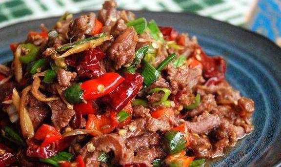 牛肉切条切片随意,切薄一点就可以。加一点点生粉,一点食用油抓匀,丢一边腌一会儿,喝汤的小勺大约五分之一勺就足够姜蒜随意切,小葱就切长段就可以,干辣椒剪段锅里放油烧热姜蒜入锅爆香,牛肉入锅大火疾速翻炒,稍稍有点变色了加白酒,然后就会有浓郁的酒香,然后这个时分还是要快手翻炒!!大火很关键。接着牛肉吧扒拉到一边,空出地位小火炸香干辣椒段,炸香即可不要炸糊了。然后牛肉把拉回来一同翻炒。牛肉切得很薄的话,变色即完全体,就差不多可以啦,不要炒久了,肉会老加盐,味精调味关火猛倒几滴山胡椒油搅匀葱段丢出来拌匀。完成