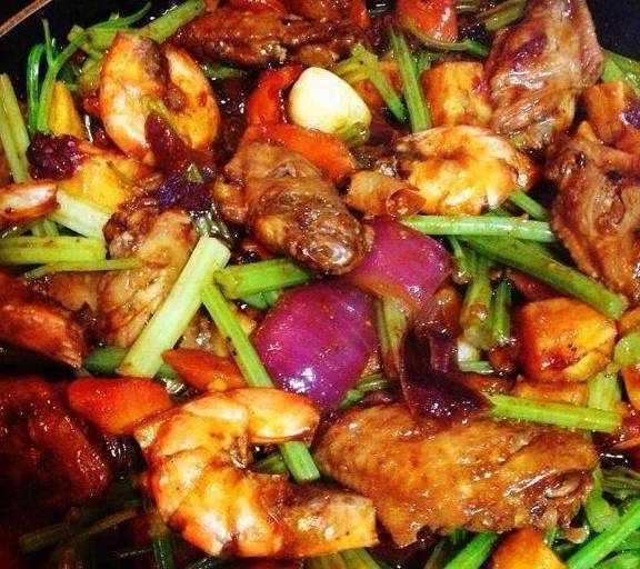 鸡翅(划斜刀好入味),虾洗净。用盐料酒生抽黑胡椒腌好。24小时。蔬菜放在一同橄榄油、黑胡椒粉、辣椒粉拌匀。酱汁:蚝油番茄酱六月鲜蒸鱼豉油糖淀粉鸡精最重要的是东北大酱和甜面酱!大概是蚝油5番茄酱4六月鲜2蒸鱼豉油2糖2.5淀粉0.8鸡精0.5东北大酱1甜面酱1)大家根据本人的口味可以过量添加减少黄油化开,放大蒜,煸香。放入一切蔬菜,炒呀炒呀炒~半熟的时分,加一点儿水。下层码上鸡翅和虾,表面悄然抹点儿“宅男女神—老干妈”加锅盖焖大概10多分钟吧!鸡翅曾经变色了但还没熟透,把我们秘制的酱汁平均的倒在下面吧!加盖3分钟左右。假如有好熟的菜可以如今放出来,例如芹菜之类的,假如没有可以忽略啦~估摸好了就可以加点儿香菜出锅啦~假如不喜欢香菜就忽略,由于我也没加!