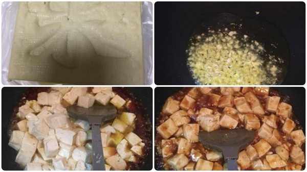 3、开始炒菜。起锅烧油,倒入蒜末爆香,再倒入调好的汁,而后再加入豆腐,开始翻炒,翻炒差不多一分钟,就可以出锅了。