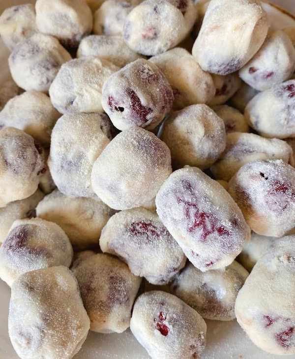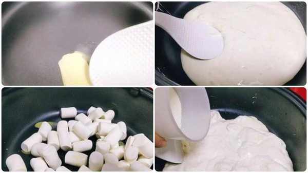 3、之后进行调制。再倒入160g棉花糖让它慢慢地融化,之后再倒入30g奶粉搅拌均匀,再把刚才准备好的红枣倒进去,搅拌搅拌,然后就趁热把红枣给夹出来,捏成你想要的形状,再在外面过上一层奶粉即可。
