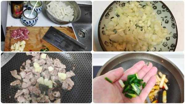 准备食材:辣椒、葱花、蒜末、五花肉,山药。