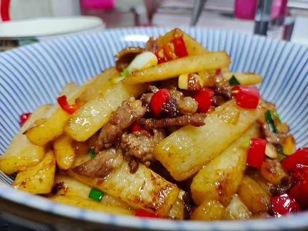 4、继续翻炒。最后快速翻炒均匀,炒出香味即可。而后这道山药炒肉就做好了,好吃又健康。