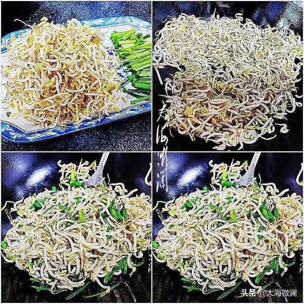 做法:自家1把绿豆生1盆绿豆芽,豆芽洗净,韭菜用蔬菜清洗剂反复清洗干净,切段。起油锅爆香花椒粒取出扔掉,爆香葱花,下入豆芽大火快速翻炒,炒至绿豆芽变色,加入韭菜,同样大火快速翻炒几下,加入六月鲜8克轻盐特级原汁酱油调味,不用加盐,提倡清淡饮食,出锅装盘。