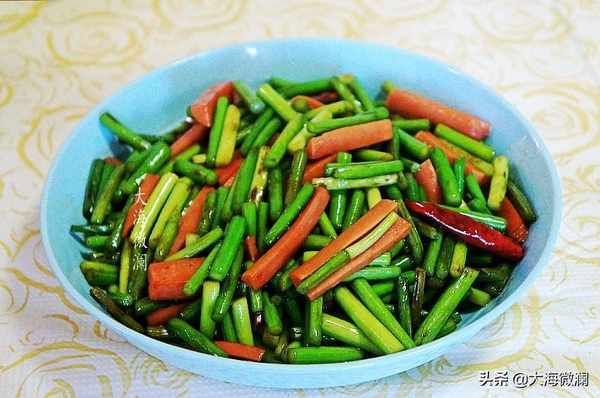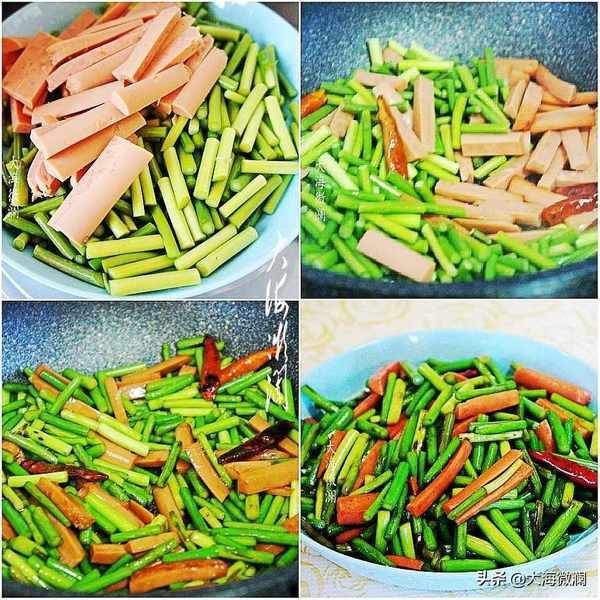 做法:蒜苔用蔬菜清洗剂反复清洗干净,切段,火腿切条。起油锅爆香姜丝、五香粉和小米椒,下入蒜苔和火腿肠翻炒,少许淋点水,让蒜苔更翠绿,口感更好。加入生抽、料酒、蘑菇粉、少许蚝油翻炒至蒜苔入味即可。蒜苔不宜炒得过烂,以免辣素被破坏,杀菌作用降低,出锅装盘。