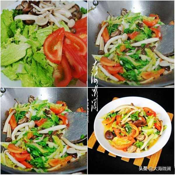 做法:小白菜用蔬菜清洗机反复清洗干净,撕成块。所有的菌菇洗净焯水,番茄洗净切片。炒锅热油爆香花椒粒捞出扔掉,加入所有食材大火快速爆炒,在极短的时间内灼烫成熟,出锅装盘。