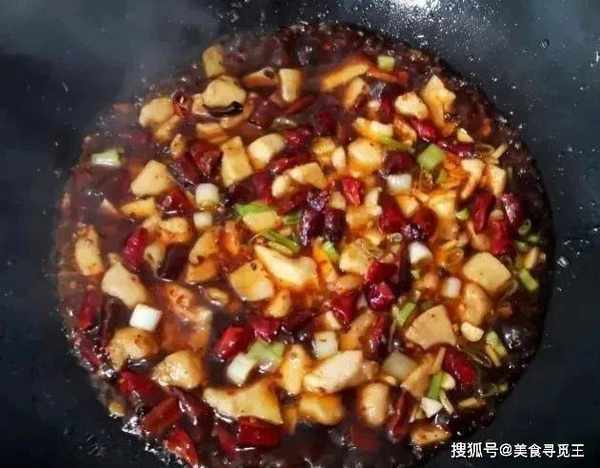3、锅留底油,下干辣椒、花椒、蒜姜炒香;倒入肉丁、葱段和调好的料汁,大火炒至粘稠时,倒入熟花生米,拌匀即可出锅!