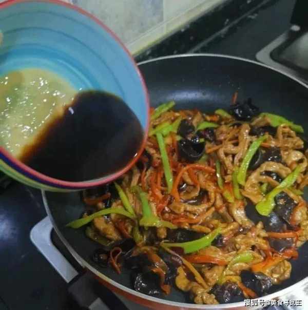 3、倒入肉丝和调好的料汁,开大火翻匀,等汤汁粘稠就可以关火了!