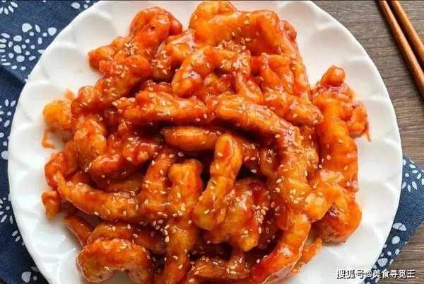 3、锅留底油,小火倒入调好的酱汁,炒至粘稠变红,倒入炸好的鸡胸肉,迅速改大火翻倍均匀即可关火;出锅前再撒些白芝麻,趁热吃,酸甜可口再美味不过!