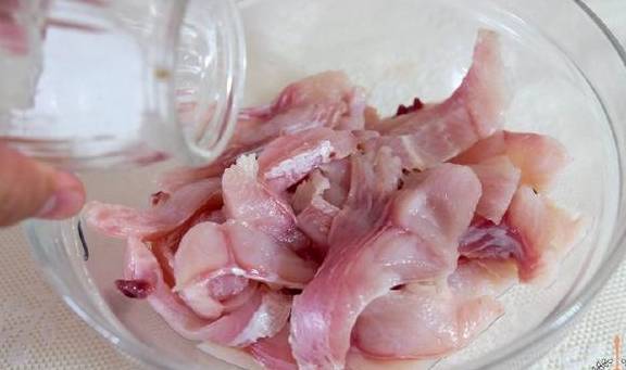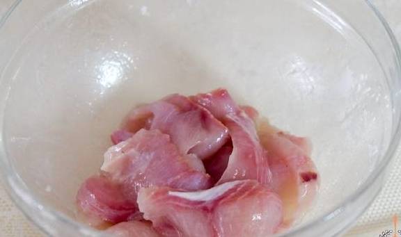 1.首先我们来处理鱼片,鳜鱼去掉骨头,然后将鱼肉倾斜切片,这样切出的鱼片更滑嫩哦!鱼片切好之后,一定要用清水漂去杂质,这样鱼片才能片片洁白细腻,光滑如玉哈哈!