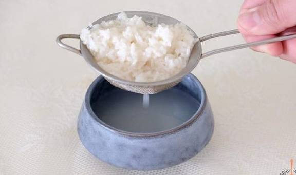 3.接着我们取一个小碗,用一个漏勺导入酒糟过滤,我们这里只需要酒糟的液体来提香哦!米粒就不用啦~