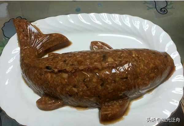 这道菜成本很低,成菜却显得品位非凡。不但没去鱼鳞还增加了鱼籽、鱼鳔等鱼杂,熬制了这款“鲫鱼冻”。