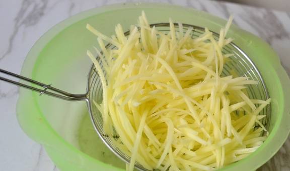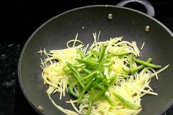 用擦丝器将土豆擦成细丝,然后放水里多清洗几次去淀粉,这样在炒制中不容易糊锅