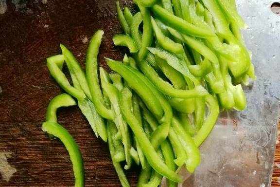 青椒去籽然后切细条,青椒的籽和旁边白色部分是辛辣主要来源,所以吃不惯就去除