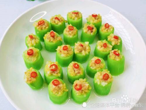 1、丝瓜去皮,切成5厘米高的小段。