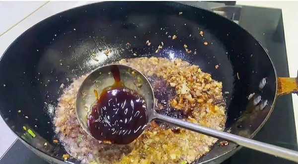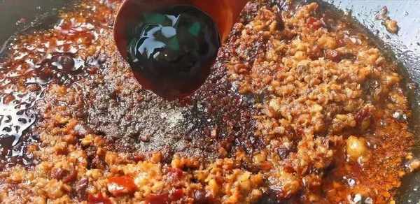 3、酱料要分三次加入,开小火慢炒,炒酱的时间在10分钟左右。
