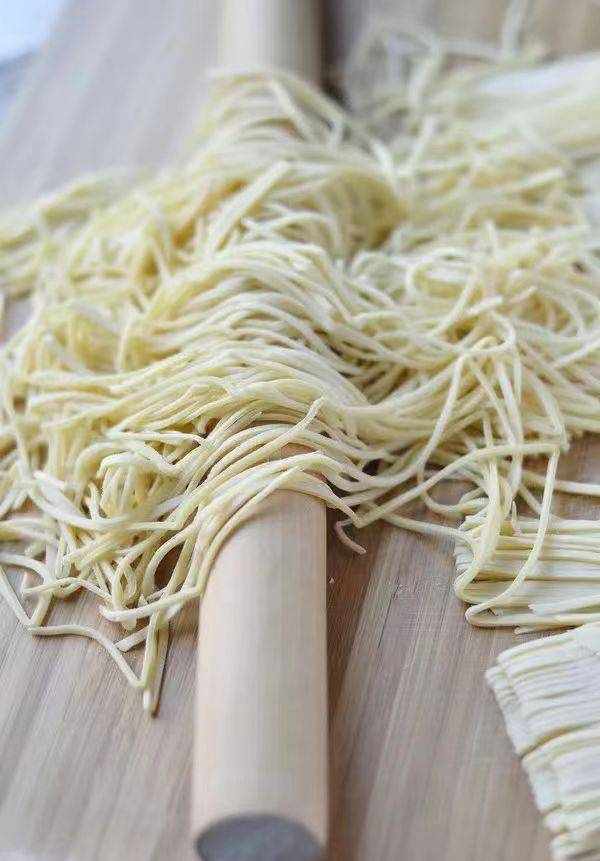 鸡蛋打成均匀蛋液,慢慢倒入面粉盆里,边倒入蛋液边用筷子搅拌,把面粉用筷子搅拌成面碎,把面碎用力揉成团。面团盖上保鲜膜,饧30分钟。取出饧过的面团再次揉匀,揉匀后再饧上20分钟。饧好的面团,在面板上用力揉成光滑的面团。把面团切成半个拳头大的面剂,揉匀后用手按扁成面饼。用快刀切成宽窄一致的面条。