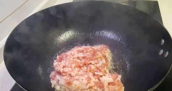 炒锅里倒入油,油热后放入肥膘粒,小火煸炒出油,倒入瘦肉粒,小火煸炒至肉粒表面发干,撒入葱花和姜末,炒出香味。