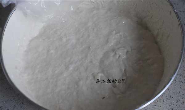 前一天晚上和好面团,加入面粉、泡打粉和水,然后加少许盐调味,用筷子搅拌至没有干粉颗粒,盖上保鲜膜放冰箱发酵。在夜晚。