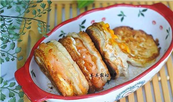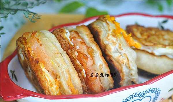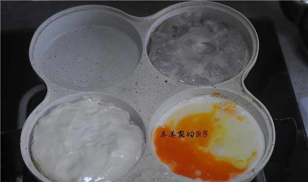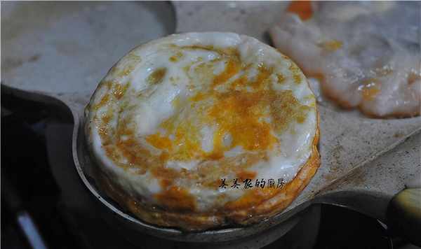 放在抹了油的煎蛋锅里,同时在其他锅里煎鸡蛋和虾饼,剩下的锅里放少许水,防止烧干。