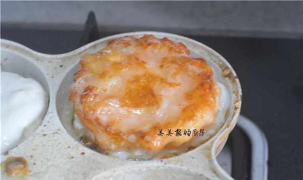 然后将鸡蛋蟹饼放在未烤好的蛋糕糊上,