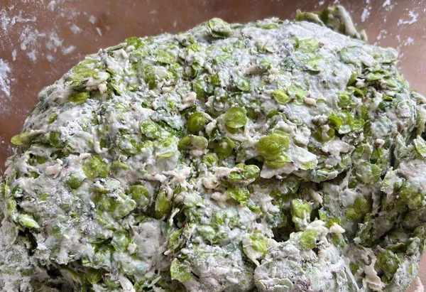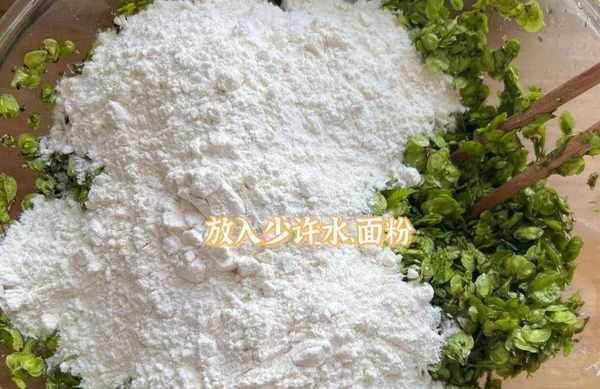 第三步,加入少量面粉,别放太多,否则窝窝做出来很硬。然后加点清水,感觉面粉和榆钱,可以揉在一起不散开就行。