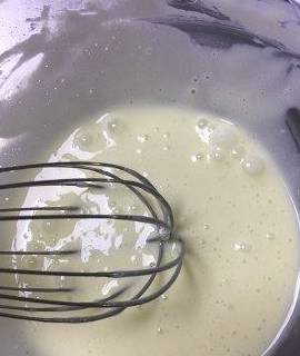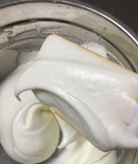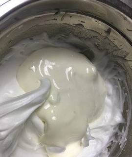 用一手动打蛋器将蛋白霜抽打顺滑(这个步骤可以让蛋白霜和奶糊更好混合均匀)觉得自己翻拌手法很牛逼的可以省略这一步