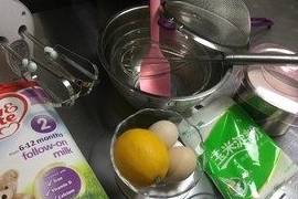 准备好所有的原材料和工具。这里提醒一下新手同学们鸡蛋要土鸡蛋,打蛋头要用平头的,玉米淀粉和奶粉选和我一样的牌子。