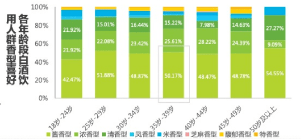 在酱酒消费者画像中,“商务男性、35岁以上、商务人士和中产阶级为主”这样的标签并不令人意外。但在“各年龄段白酒饮用人群香型喜好”这项调查中,除了35-39岁和50岁以上人群对酱酒的喜好比例占到5成以上,25-29岁人群也以51.88%的占比成为三个对酱酒喜好占比超50%以上的人群之一,甚至还要高于35-39岁年龄段的50.17%,酱酒消费人群出现“低龄化”趋势。